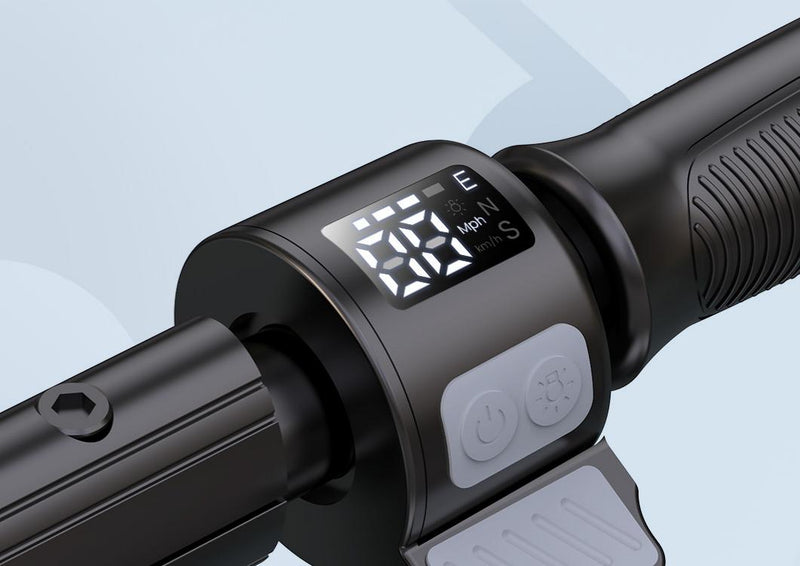 R: L'écran affiche : batterie, vitesse, mode et éclairage.
