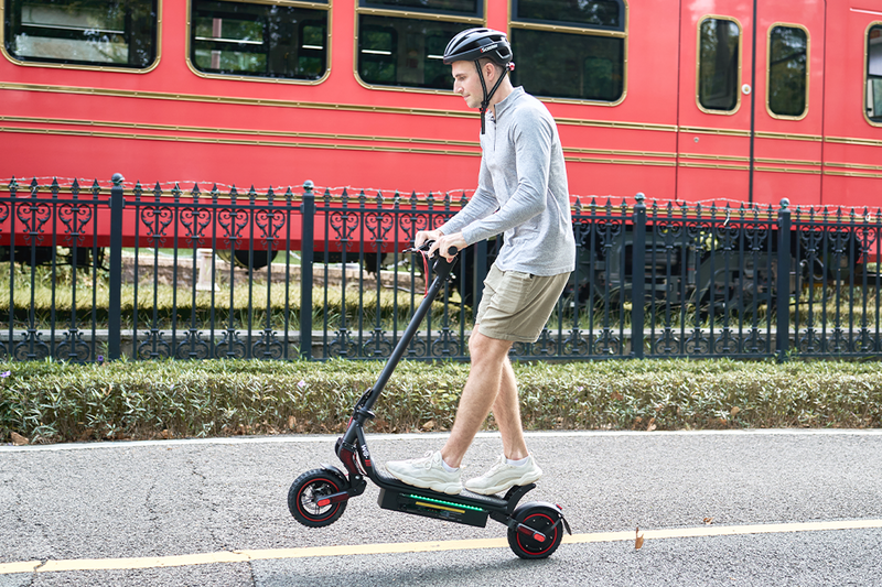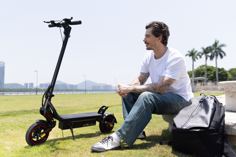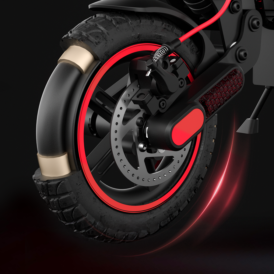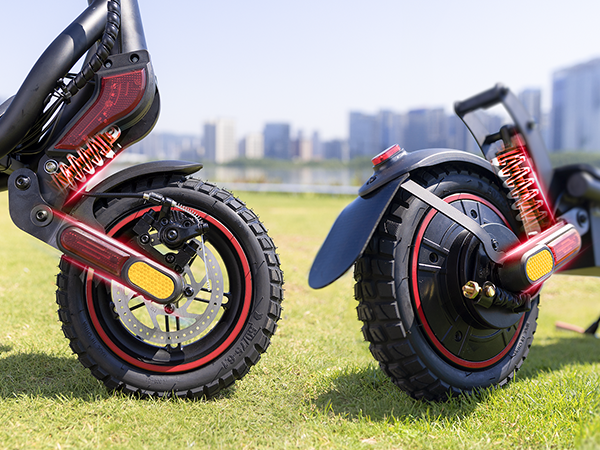 Pneus pneumatiques 9,3" + suspensions avant et arrière pour une stabilité optimale et des trajets toujours plus fluides, même sur routes irrégulières.